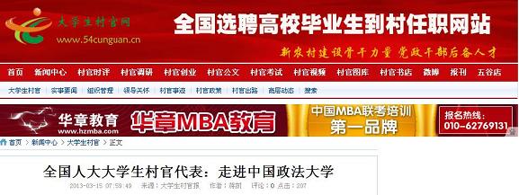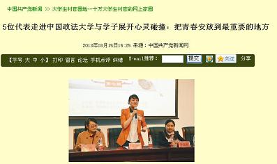 多家媒体报道我校全国人大大学生村官代表进校园活动 作者: 发布时间:2013年04月15日 00:00 阅读数: 3月12日,应老王论坛 的邀请,由老王论坛 学生会承办,冼润霞、朱虹、叶瑜、李欣蓉、梁丽娜等五位全国人大大学生村官代表进校园活动在我校昌平校区举行。 本次活动引起了包括人民网、中国人大网、新华网、中国经济网、南方网、大学生村官网、大学生村官之家、大学生村官报等在内的多家国内主力新闻媒体的关注,全文转载了我校全国人大大学生村官代表进校园的活动。 分享到: