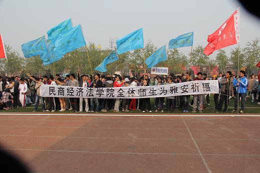 全体师生为雅安祈福”的签名横幅,表达对灾区人民的牵挂和一份深情厚谊,彰显了当代大学生的高度社会责任感和良好的精神风貌。