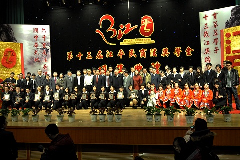 颁奖典礼的最后,江平先生的夫人崔琦女士为我们揭晓了第十三届江平民商法奖学金第一名得主——国际法学院的刘东辉同学,掀起了本次晚会最大的高潮。简短的致辞之后,刘东辉走下舞台,将手中的鲜花献给江老,将江老请上舞台。在全场热烈的掌声之中,江平教授开始讲话,他表示,希望同学们把更多的赞美送给幕后工作人员和其他的同仁们。江老的朴实言辞和谦逊态度令同学们感触良多。随后,江老向所有的获奖者颁发江平奖学金获奖奖牌并与18位获奖者合影留念。在经久不息的掌声之中,第十三届江平民商法奖学金颁奖典礼圆满落幕。今年的江奖虽已结束,但江奖的精神还会在我们的心中永驻,成为在场每个人心中永远的目标与动力。