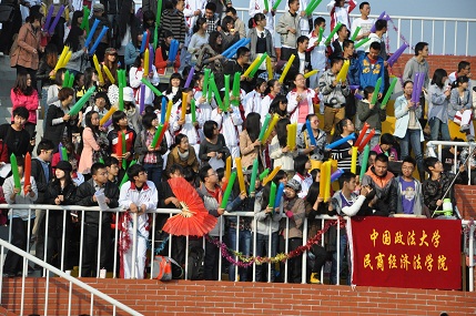 绿茵场上的运动健儿们挥洒汗水,用自己的青春续写民商王朝的辉煌。赛场外,观众们一次又一次的欢呼和呐喊更是为这场运动会添上了浓墨重彩的一笔。“民商,加油!”、“民商民商,天下无双;民商民商,我为你狂!”每当有运动员经过看台前,现场的观众都用最整齐响亮的口号为他们加油助威,用一次次的呐喊为民商辉煌的铸就贡献自己一份力量。