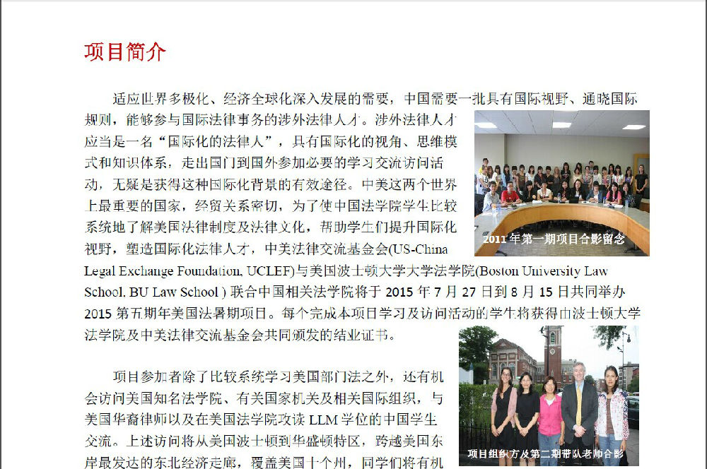 第五期美国法暑期项目通知——波士顿大学法学院 作者: 发布时间:2015年03月23日 00:00 阅读数: 申请程序: 中国法学院在读本科生及研究生均可申请参加本项目。 有意参加本项目的,请按照下列说明,提交材料,完成申请程序: 1、填写申请表(见下文),将填好的申请表、中英文个人简历及近期免冠正面照片(JPEG 文件) 发送邮件到[email protected]。咨询电话:58909324(孙老师) 2、 报名时间:2015年3月15日——4月15日。提醒:赴美需要办理护照、签证及购买机票等相关事宜;暑期属于赴美旺季,机票十分紧张。有意参加该项目的学生请尽早报名。 分享到: